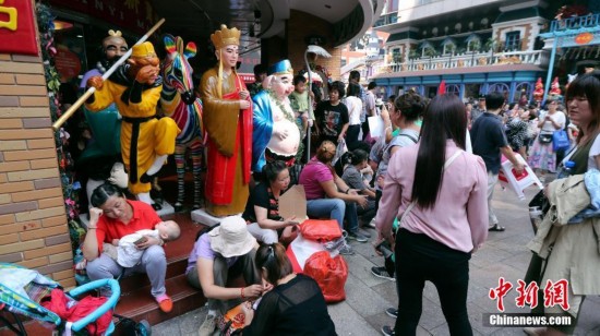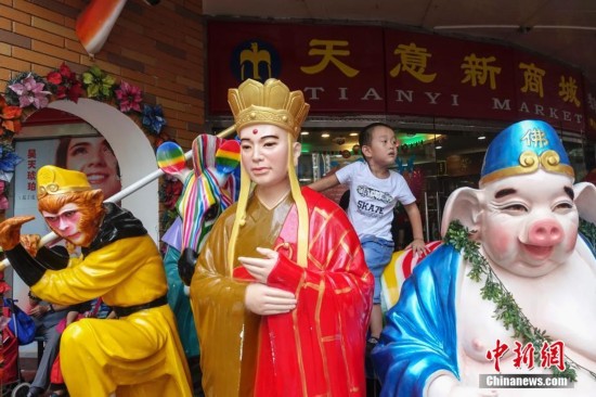9月15日,一孩童坐在天意門前西游記師徒雕像上遠眺。當日,自1992年開業(yè)至今的北京天意市場迎來其在北京西城阜外大街營業(yè)的最后一日,商家趁機“瘋狂甩貨”,大批北京民眾也紛至沓來。這里曾是北京著名的小商品商城,聚集了數(shù)千家商戶。為疏解北京非首都功能,天意商城將于本月16日關(guān)門停業(yè)。中新社記者 崔楠 攝