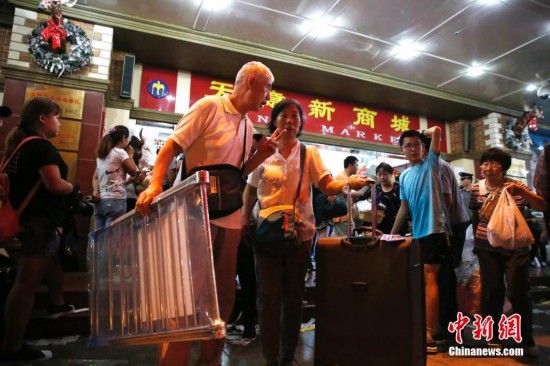 9月15日,顧客在天意商城門口休息。當日,商戶在北京天意商城甩賣商品,吸引大批顧客搶購。天意商城是北京規(guī)模最大的小商品批發(fā)兼零售市場,為疏解北京非首都功能,天意商城將于9月16日關(guān)門停業(yè)。中新社記者 盛佳鵬 攝