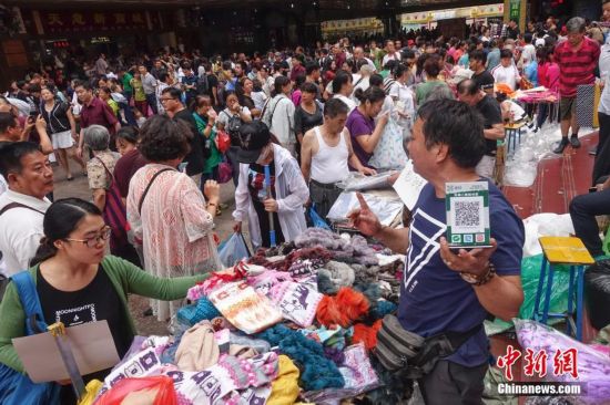 9月15日,天意商戶舉起二維碼方便顧客掃碼支付,以新式支付方式助力傳統(tǒng)零售。當日,自1992年開業(yè)至今的北京天意市場迎來其在北京西城阜外大街營業(yè)的最后一日,商家趁機“瘋狂甩貨”,大批北京民眾也紛至沓來。這里曾是北京著名的小商品商城,聚集了數(shù)千家商戶。為疏解北京非首都功能,天意商城將于本月16日關(guān)門停業(yè)。中新社記者 崔楠 攝