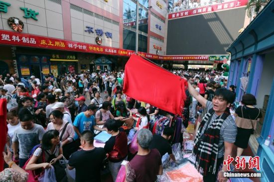 9月15日,商戶在北京天意商城甩賣商品,吸引大批顧客搶購。天意商城是北京規(guī)模最大的小商品批發(fā)兼零售市場,為疏解北京非首都功能,天意商城將于9月16日關(guān)門停業(yè)。中新社記者 盛佳鵬 攝