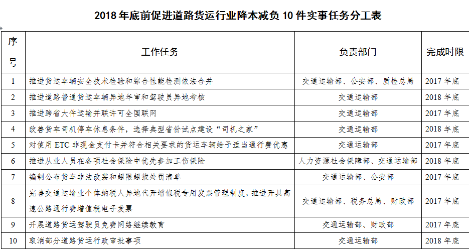 2018年底前,完成降本減負10件實事(見附件),推動政策落地并取得實質(zhì)性進展。制度性交易成本大幅降低,貨車司機生產(chǎn)生活條件顯著改善,貨運業(yè)戶的獲得感和貨車司機的歸屬感持續(xù)增強,行業(yè)平穩(wěn)發(fā)展的基礎更加牢固。