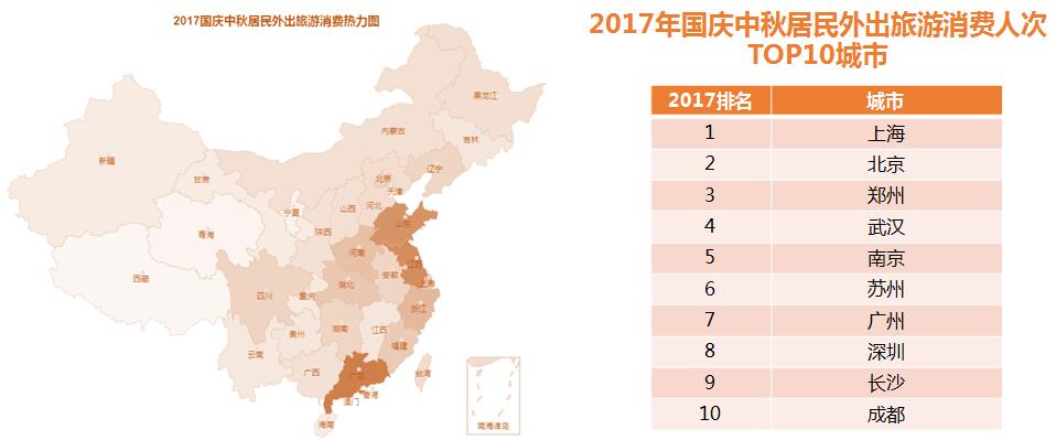 2017年國慶中秋居民外出旅游消費(fèi)人次TOP10城市:上海、北京、鄭州、武漢、南京、蘇州、廣州、深圳、長沙、成都。
