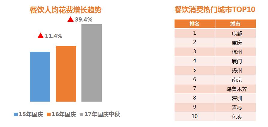 餐飲消費(fèi)熱門城市TOP10:成都、重慶、杭州、廈門、揚(yáng)州、南京、烏魯木齊、深圳、青島、包頭。