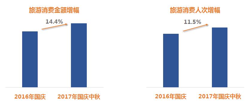 2017年國慶、中秋佳節(jié)雙節(jié)喜相逢,假期疊加形成8天“超級黃金周”,居民出游意愿較高,旅游需求旺盛,旅游消費(fèi)金額及人次同比增幅均在10%以上。
