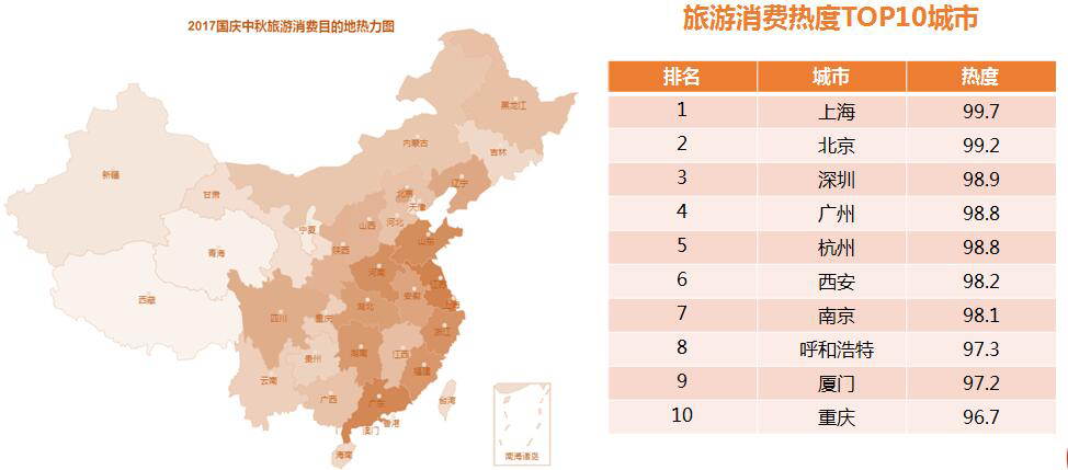 2017年國慶中秋假日旅游消費(fèi)熱門目的地輻射范圍較廣,華東、華中、華南、東北地區(qū)旅游消費(fèi)熱度均較高,其中熱度TOP10城市均為知名旅游城市。