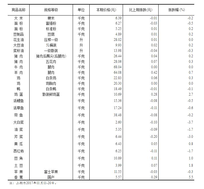 人民網(wǎng)北京12月4日電 據(jù)國家統(tǒng)計局網(wǎng)站消息,國家統(tǒng)計局今日公布50個城市主要食品平均價格變動情況(2017年11月21-30日)。數(shù)據(jù)顯示在27種主要食品中,與11月中旬相比,大米、面粉、芹菜等12種食品價格下降,大豆油、羊肉等13種食品價格上漲,2種持平。其中,大白菜價格跌幅最大,為3.7%;香蕉價格漲幅最大,為5.5%。(朱江)smX安康新聞網(wǎng)