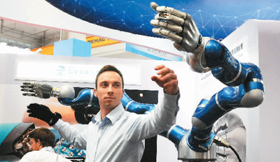 | 8月24日,北京亦創(chuàng)國際會展中心機器人大會上,一位德國的技術(shù)人員在展示機器人。 |