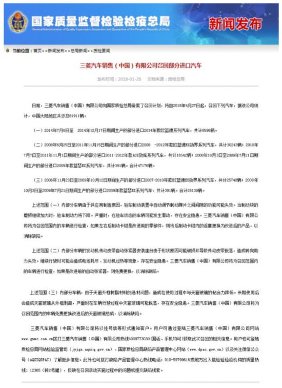 三菱汽車銷售(中國(guó))有限公司召回部分進(jìn)口汽車