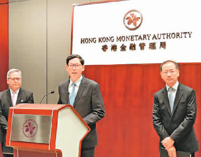 | 香港金融管理局總裁陳德霖(中)在介紹外匯基金投資回報(bào)情況。 |