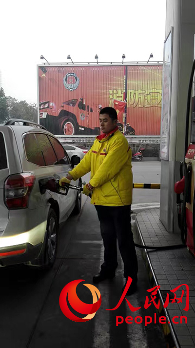 中國(guó)石油陜西安康銷售分公司三橋加油站工作人員正在給私家車(chē)加油。(人民網(wǎng) 朱江 拍攝)