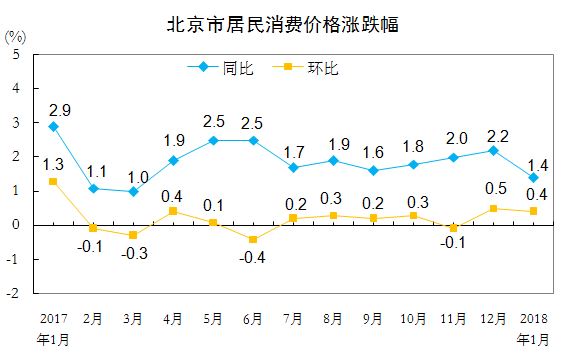 人民網(wǎng)北京2月13日電 據(jù)北京市統(tǒng)計(jì)局網(wǎng)站消息,國家統(tǒng)計(jì)局北京調(diào)查總隊(duì)、北京市統(tǒng)計(jì)局日前公布2018年1月份北京市居民消費(fèi)價(jià)格變動(dòng)情況。2018年1月份,北京市居民消費(fèi)價(jià)格總水平同比上漲1.4%。其中,食品價(jià)格下降1.5%,非食品價(jià)格上漲2.0%;消費(fèi)品價(jià)格下降0.2%,服務(wù)價(jià)格上漲3.7%。