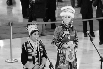 藏族代表卓嘎(左)與赫哲族代表劉蕾在“代表通道”接受中外媒體記者采訪(fǎng)。