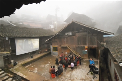| 在南康侗寨的一戶村民家門口,有一塊大約半個籃球場大的曬谷場空地,肖錦生取出長繩往門楣上掛去,然后拉直、打結(jié)、綁緊,不到十分鐘,一張大銀幕掛了起來。在確定電影機位后,他嫻熟地架起放映機,接電源、調(diào)試音響,認真地操作著每一個環(huán)節(jié)。 |