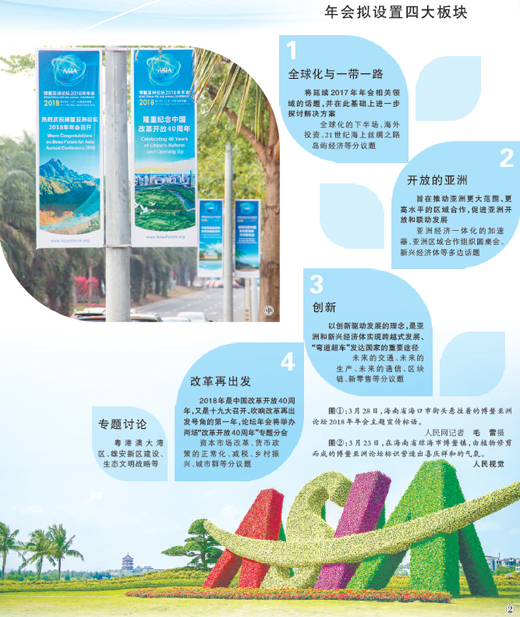 博鰲亞洲論壇2018年年會將于4月8日至11日舉行,主題為“開放創(chuàng)新的亞洲 繁榮發(fā)展的世界”。年會將聚焦改革、開放、創(chuàng)新以及全球化和“一帶一路”等議題,為亞洲的進一步開放、聯(lián)動、創(chuàng)新發(fā)展建言獻策,為世界經濟穩(wěn)步復蘇凝心聚力
