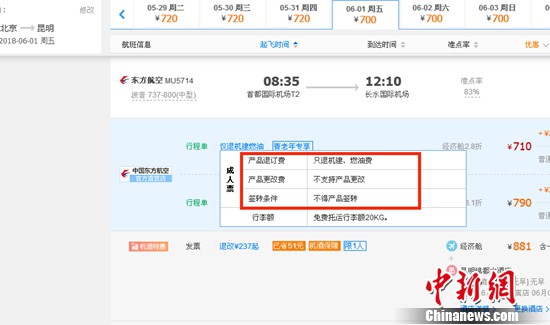 記者在攜程網(wǎng)上預(yù)訂6月1日北京到昆明的東方航空MU5714票價為710元(2.8折),顯示“只退機(jī)建、燃油費(fèi)”“不支持產(chǎn)品更改”。