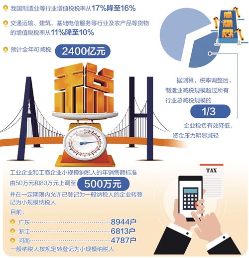 從5月1日起,我國制造業(yè)等行業(yè)增值稅稅率從17%降至16%,交通運輸、建筑、基礎電信服務等行業(yè)及農(nóng)產(chǎn)品等貨物的增值稅稅率從11%降至10%,預計全年可減稅2400億元。