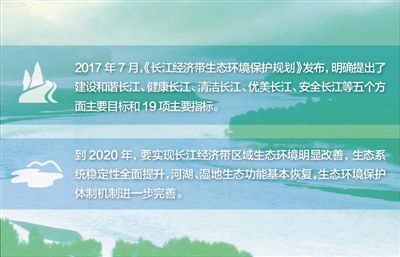 長江大保護(hù),規(guī)劃先行。2016年,《長江經(jīng)濟(jì)帶發(fā)展規(guī)劃綱要》印發(fā)。去年7月,《長江經(jīng)濟(jì)帶生態(tài)環(huán)境保護(hù)規(guī)劃》發(fā)布,提出了建設(shè)和諧長江、健康長江、清潔長江、優(yōu)美長江、安全長江等五個(gè)方面主要目標(biāo)和19項(xiàng)主要指標(biāo)——到2020年,要實(shí)現(xiàn)長江經(jīng)濟(jì)帶區(qū)域生態(tài)環(huán)境明顯改善,生態(tài)系統(tǒng)穩(wěn)定性全面提升,河湖、濕地生態(tài)功能基本恢復(fù),生態(tài)環(huán)境保護(hù)體制機(jī)制進(jìn)一步完善;地表水質(zhì)量國控?cái)嗝妫c(diǎn)位)達(dá)到或優(yōu)于Ⅲ類水質(zhì)比例達(dá)到75%以上,劣Ⅴ類比例小于2.5%,地級(jí)及以上城市集中式飲用水水源水質(zhì)達(dá)到或優(yōu)于Ⅲ類比例達(dá)到97%以上。