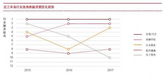 2017年,獨(dú)角獸公司年度融資總額排在前三位的行業(yè)是交通汽車、金融科技和企業(yè)服務(wù)。其中,交通汽車和金融科技領(lǐng)域在最近三年一直受到投資機(jī)構(gòu)和投資人的熱捧。