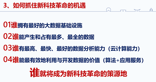 這一次新的科技革命,誰成為它的策源地,誰就會成為科技強國,這個也是十九大習(xí)近平總書記給我們提出的要求,到2050年中國要成為科技強國。要想成為科技策源地主要的競爭將會在四個層面展開:第一,誰擁有最好的大數(shù)據(jù)基礎(chǔ)設(shè)施;第二,誰能產(chǎn)生和占有最多、最全的數(shù)據(jù);第三,誰有最高、最快、最好的數(shù)據(jù)分析能力;第四,誰能最有效地利用與開發(fā)數(shù)據(jù)的價值,假如在這四個層面我們?nèi)梢灶I(lǐng)先世界,我們就是新的科技革命的策源地。