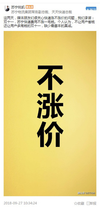 面對(duì)快遞公司的紛紛漲價(jià),不少剁手黨們擔(dān)心,最后的成本都會(huì)出在自己身上。針對(duì)這一熱點(diǎn)話題,9月27日,蘇寧物流常務(wù)副總裁姚凱通過(guò)微頭條發(fā)聲,承諾這個(gè)雙十一,蘇寧快遞費(fèi)用不漲一毛錢!他認(rèn)為,不為用戶省錢還讓用戶多掏錢的雙十一,缺少最基本的真誠(chéng)。