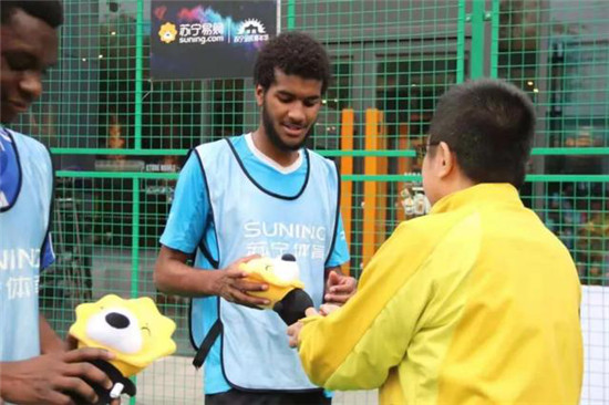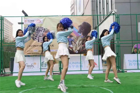 中場(chǎng)休息,活力四射的足球?qū)氊悅優(yōu)樗袘?zhàn)獅加油助威,引爆整個(gè)蘇寧易購(gòu)廣常
