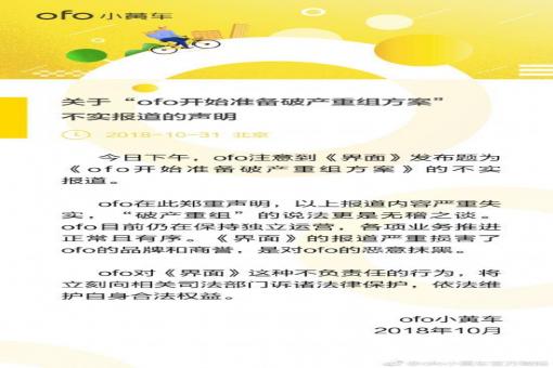 31日下午,ofo在官方微博發(fā)布一份聲明,稱此前媒體報(bào)道的“ofo開始準(zhǔn)備破產(chǎn)重組方案”的說法是無稽之談,ofo將立刻訴諸法律保護(hù),維護(hù)自身合法權(quán)益。 ofo官方聲……