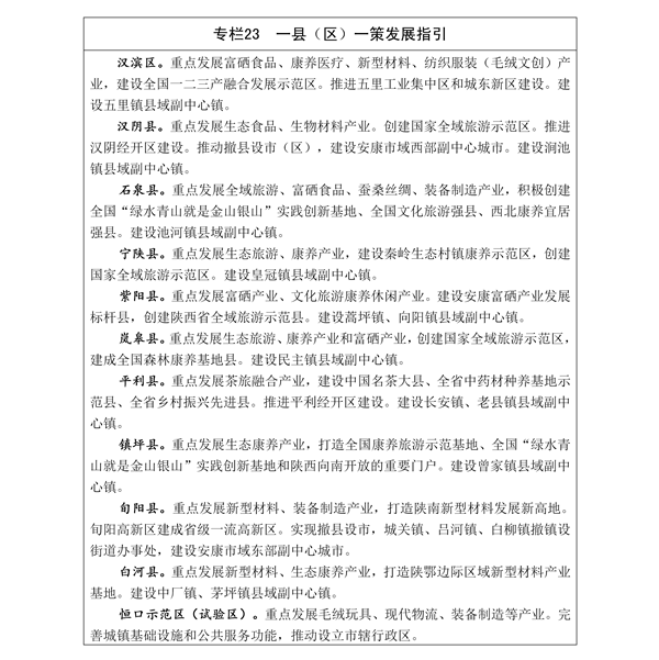 構(gòu)建“一核、兩心、兩帶、多點”新型城鎮(zhèn)化格局。一核:以中心城市為核心,推動瀛湖生態(tài)旅游區(qū)、恒口示范區(qū)(試驗區(qū))融入中心城市發(fā)展。兩心:推進(jìn)漢陰、旬陽市域副中心城市建設(shè)。兩帶:月河川道城鎮(zhèn)帶,統(tǒng)籌中心城市—恒口—漢陰—石泉協(xié)同發(fā)展,建設(shè)城鄉(xiāng)統(tǒng)籌示范區(qū)、新型工業(yè)聚集區(qū)、綠色發(fā)展引領(lǐng)區(qū)。漢江生態(tài)城鎮(zhèn)帶,以漢濱、石泉、旬陽為核心,漢陰、紫陽、嵐皋、白河為節(jié)點,輻射帶動其他區(qū)域,打造三產(chǎn)融合發(fā)展的漢江生態(tài)城鎮(zhèn)帶。多點:以其他縣城、重點鎮(zhèn)、縣域工業(yè)集中區(qū)、現(xiàn)代農(nóng)業(yè)園區(qū)和旅游景區(qū)為節(jié)點,打造縣域經(jīng)濟增長極。