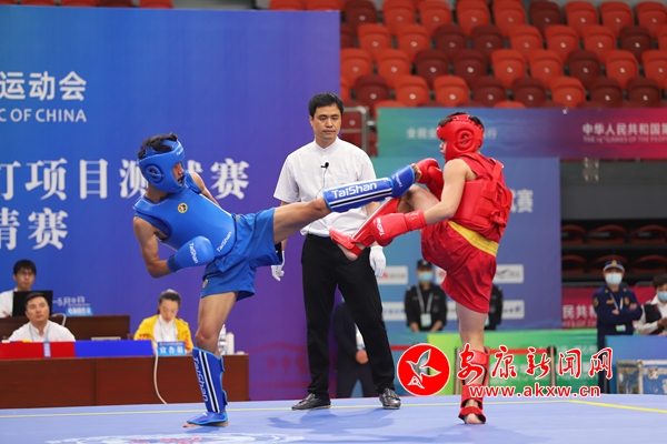 “開始!”隨著裁判員口令,紅藍雙方運動員立即展開了激烈的爭奪,賽場上他們毫無畏懼,拳法剛勁兇猛,腿法雷霆萬鈞,摔法干脆利落。“拳腿結(jié)合”“主動點”場下教練不時提醒。觀眾席不斷響起熱烈的掌聲。