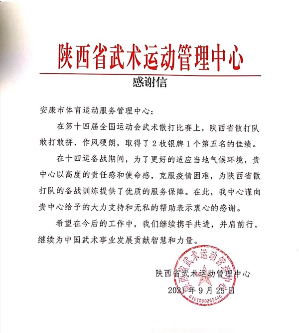 第十四屆全國運(yùn)動(dòng)會(huì)武術(shù)散打比賽圓滿結(jié)束,陜西省散打隊(duì)敢打敢拼、作風(fēng)硬朗,取得了2枚銀牌1個(gè)第五名的佳績。在十四運(yùn)備戰(zhàn)期間,我市克服疫情困難,為陜西省散打隊(duì)的備戰(zhàn)訓(xùn)練提供了優(yōu)質(zhì)的服務(wù)保障,讓隊(duì)員更好地適應(yīng)安康氣侯環(huán)境。感謝信中寫道:“希望在今后的工作中,繼續(xù)攜手共進(jìn),并肩前行,為中國武術(shù)事業(yè)發(fā)展貢獻(xiàn)智慧和力量。”