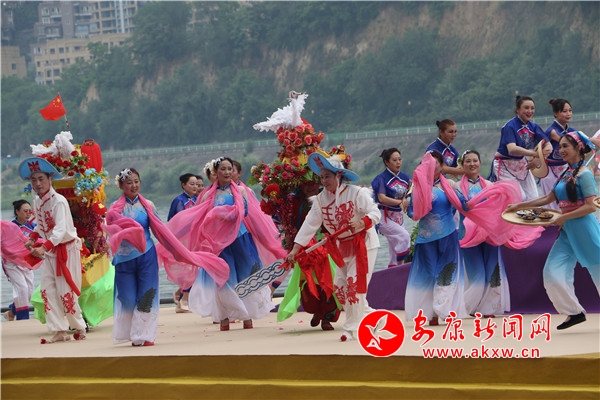 傳統儀式結束后,歌舞《打谷歡歌》、水岸表演《舞動漢江 活力安康》、民俗展演《向幸福出發(fā)》、新編漢劇《大美安康》、全新原創(chuàng)歌曲《端午最安康》相繼登臺,優(yōu)美的舞蹈配合婉轉唱腔,寓情于景,將傳統與現代、生活與藝術融合得恰到好處。期間還穿插進行了安康最富神采的經典龍舟民俗項目——龍舟橫渡和搶鴨子、摸鯉魚。伴隨著震撼的鼓點聲,29支參賽龍舟隊伍的健兒們劈波斬浪,你追我趕,爭相抵達江岸。隨后,只見江面上水花飛濺,龍舟健兒們從龍舟上一躍而下,在湍急的江水中徒手捕捉浮游于江面的鴨子和鯉魚,勝利者將手中的魚兒與鴨子高高舉起,把富貴吉祥、安寧康泰的祝福送給大家。最后,第二十二屆中國安康漢江龍舟節(jié)主題活動在歌曲《hello 安康》喜悅的氛圍中圓滿落幕。