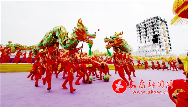 氣勢磅礴的開篇之后,進入安康龍舟風俗中的傳統儀式——龍頭祭祀。舞臺上,60人的盾牌方陣大喊三聲,請龍方陣邁著鏗鏘步伐護送龍頭立于舞臺正中。主祭官站上高臺,捋龍須,撣浮塵,三叩首,吟敬酒詞,依次指引完成祭龍、合龍儀式,代表萬千百姓向天祈福風調雨順、萬家平安。緊接著,9條祥龍飛舞而來,18名來自基層一線的先進代表、鄉(xiāng)村振興佼佼者、新民風建設的優(yōu)秀代表、臺灣同胞代表、冠名商代表、安康商業(yè)精英等走上舞臺共同為龍頭點睛。