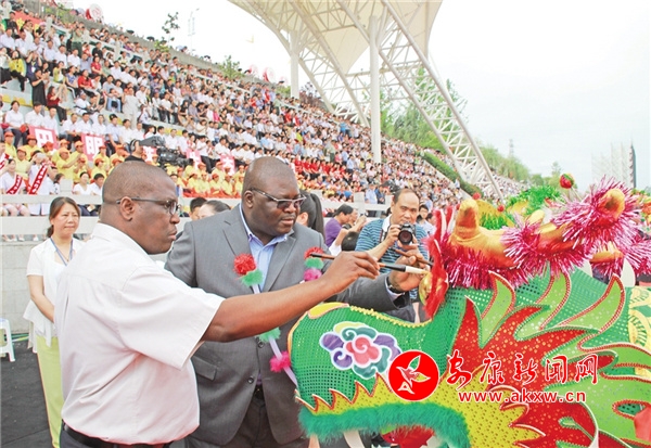2016年,第十六屆安康龍舟節(jié)開幕式上,外國友人為龍頭點(diǎn)睛。 張喬 攝
