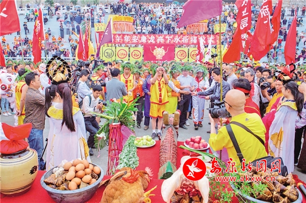 2014年,第十四屆安康龍舟節(jié)期間,人們?cè)跐h江龍舟苑舉行傳統(tǒng)祭祀儀式。 邵向東 攝