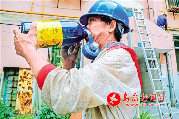 圖6:7月17日下午,漢濱區(qū)印染廠社區(qū)內(nèi),中國電信公司安康分公司施工人員的作業(yè)間隙。 李春江 攝