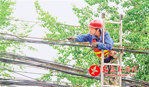 與此同時,不遠(yuǎn)處的公路局家屬院內(nèi),國網(wǎng)漢濱分公司的工作人員也正在隔離區(qū)域內(nèi)進(jìn)行空中作業(yè)。盡管汗水浸濕了厚重的牛仔工裝,但為了盡量縮短施工時間,現(xiàn)場的工作人員仍以最快的速度甄別、剪除廢線,梳理捆扎。不一會兒,一小片雜亂線纜就變得橫平豎直、高低一致、規(guī)范有序。