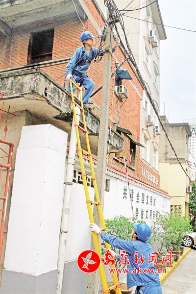 圖1、2、3:7月18日上午,在漢濱區(qū)大南街,國網(wǎng)安康供電公司漢濱供電分公司的工作人員正在對電網(wǎng)線路進(jìn)行整治。 記者 張喬 攝