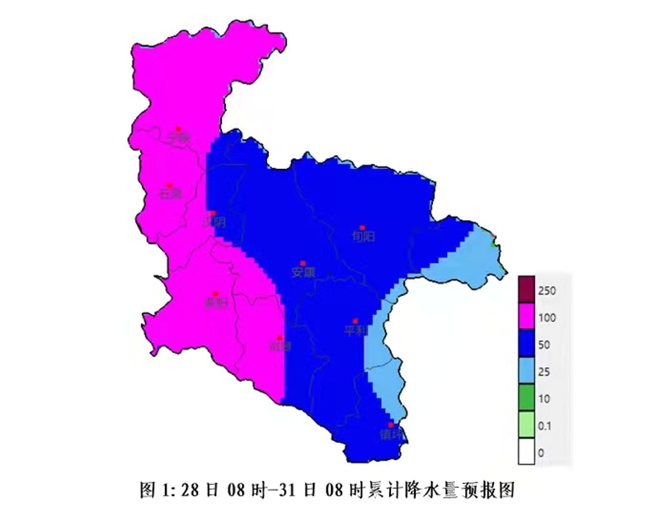 29日白天至夜間全市大雨(25~40mm),紫陽、嵐皋、漢陰、 石泉、漢濱、旬陽、平利西北部、寧陜南部大到暴雨(40~75mm) ,紫陽西部、嵐皋西部個別鎮(zhèn)村有大暴雨(100~150mm)。