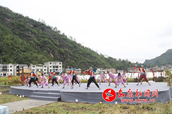 在純凈的背景下,舞蹈《歡天喜地慶秋收》、歌伴舞《開缸酒》、漁鼓道情《生態(tài)旅游興旬陽》、小品《電商助農(nóng)促豐收》、表演唱《群雁回歸興鄉(xiāng)村》、《咱老百姓》、歌舞《追夢綠色向未來》等節(jié)目精彩上演, 獨特的舞臺形式將豐收盛景定格在畫卷中,舞者起舞慶豐收,舞出了農(nóng)人心中的喜悅,傳遞著農(nóng)人豐收的幸福。