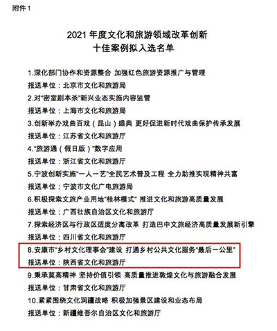 本網(wǎng)訊 近日,文化和旅游部發(fā)布《關(guān)于2021年度文化和旅游領(lǐng)域改革創(chuàng)新十佳案例、優(yōu)秀案例名單的公示》,《安康市“鄉(xiāng)村文化理事會(huì)”建設(shè) 打通鄉(xiāng)村公共文化服務(wù)“最后一公里”》上榜2021年度文化和旅游領(lǐng)域改革創(chuàng)新十佳案例公示名單。