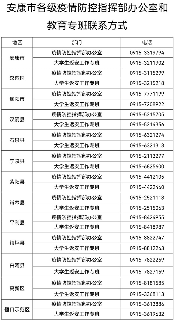 1.安康市各級疫情防控指揮部辦公室和教育專班聯系方式