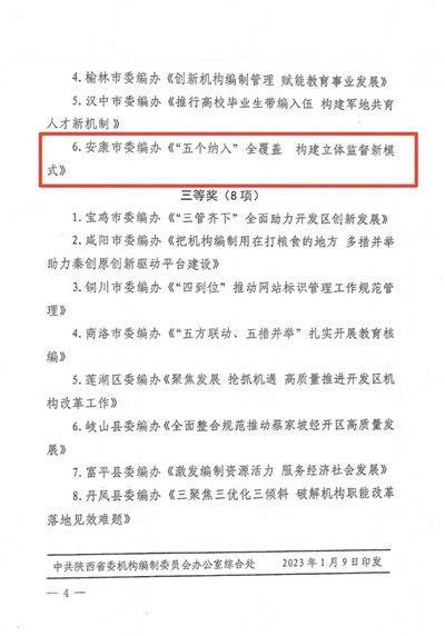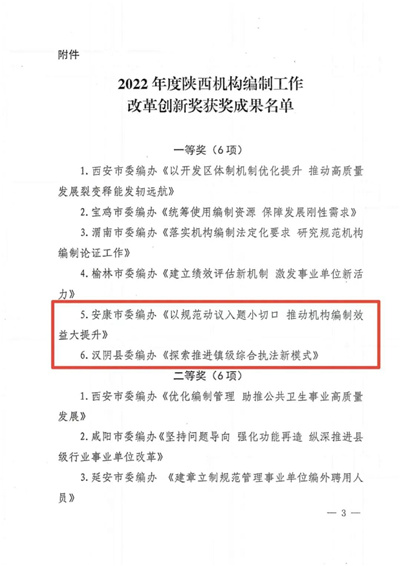 日前,2022年度陜西省機(jī)構(gòu)編制工作改革創(chuàng)新獎評選結(jié)果揭曉,入選全省機(jī)構(gòu)編制系統(tǒng)20項(xiàng)獲獎成果中,我市3項(xiàng)改革創(chuàng)新成果斬獲一等獎2名、二等獎1名,獲獎等次和數(shù)量位居全省第一。
