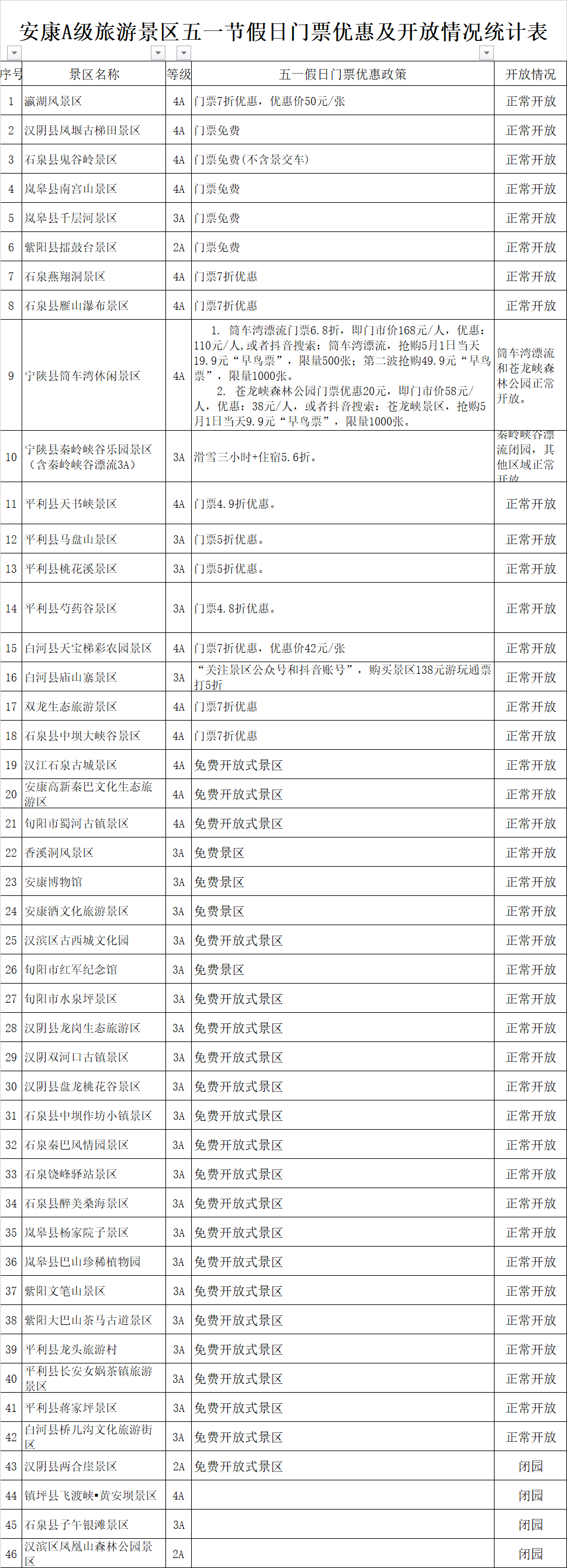 13家收費(fèi)景區(qū)推出門票打折優(yōu)惠活動(dòng):瀛湖風(fēng)景區(qū)推出“五一”期間門票7折優(yōu)惠,優(yōu)惠價(jià)50元/張;石泉燕翔洞景區(qū)、石泉縣雁山瀑布景區(qū)、石泉縣中壩大峽谷景區(qū)推出“五一”期間門票七折優(yōu)惠;雙龍生態(tài)旅游景區(qū)推出“五一”期間門票7折優(yōu)惠;平利縣天書峽景區(qū)推出“五一”期間門票4.9折優(yōu)惠;白河縣天寶梯彩農(nóng)園景區(qū)推出“五一”期間門票7折優(yōu)惠,優(yōu)惠價(jià)42元/張;平利縣馬盤山景區(qū)推出“五一”期間門票5折優(yōu)惠;平利縣桃花溪景區(qū)推出“五一”期間門票5折優(yōu)惠;平利縣芍藥谷景區(qū)推出“五一”期間門票4.8折優(yōu)惠。