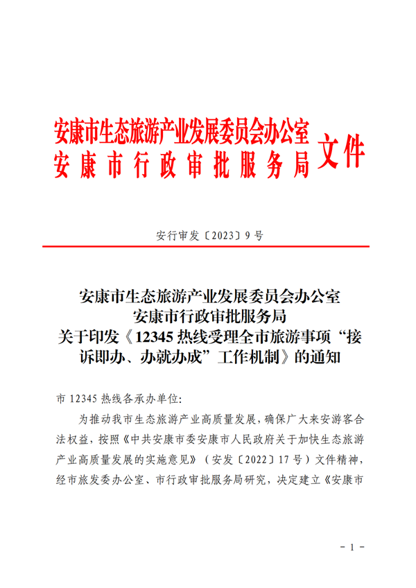 為推動我市生態(tài)旅游產(chǎn)業(yè)高質(zhì)量發(fā)展,確保廣大來安游客合法權(quán)益,按照《中共安康市委安康市人民政府關(guān)于加快生態(tài)旅游產(chǎn)業(yè)高質(zhì)量發(fā)展的實施意見》(安發(fā)〔2022〕17號)文件精神,經(jīng)市旅發(fā)委辦公室、市行政審批服務(wù)局研究,決定建立《安康市12345熱線受理全市旅游事項“接訴即辦、辦就辦成”工作機制》,請認真抓好貫徹落實。