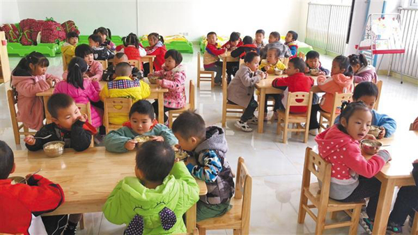 漢陰縣澗池鎮(zhèn)紫云南郡社區(qū)幼兒園內(nèi),孩子們在用餐(資料照片)。
