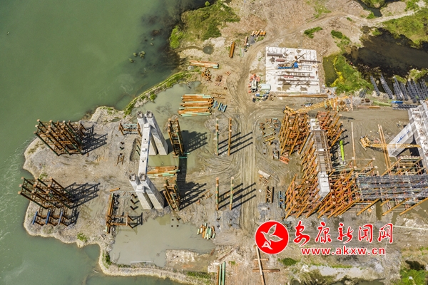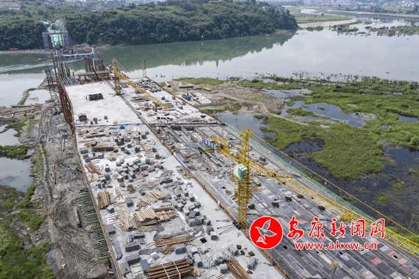 5月11日雨后初晴,安康新關廟漢江大橋建設正有序進行。據介紹,5月10日大橋主橋所有樁基完成混凝土灌筑,這也為大橋如期竣工奠定基礎。新關廟漢江大橋是“兩橋一路”控制性項目,也是我市“十四五”重大基礎設施建設項目,2023年民生實事票決項目之一。工程于2022年3月開工,計劃2026年3月通車,工期4年。(記者 潘潤生 攝)BxJ安康新聞網