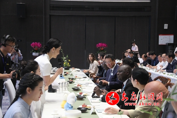“大使品茶”為現(xiàn)場(chǎng)嘉賓呈現(xiàn)了一場(chǎng)精彩絕倫的茶文化盛宴。 茶香琴韻相伴下,與會(huì)嘉賓欣賞茶藝、體驗(yàn)茶道,品茗點(diǎn)評(píng)了安康富硒茶中的綠茶、白茶、紅茶、秦漢古茶,以及福州茉莉花茶、湖南君山銀針等茗茶,各類茶品飄逸外觀和濃香入肺的回味給嘉賓們留下了深刻印象。