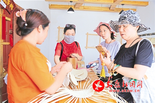 “一扇天下”的女主人叫李宗琴,作坊里有編制的螞蚱、蝎子、竹蜻蜓、竹簍、棕扇等,就連店里的微信收款二維碼也是編制而成。李宗琴是中壩村人,出嫁外地后,聽(tīng)說(shuō)村里建成作坊小鎮(zhèn),返鄉(xiāng)辦起手工編織作坊。自己編棕扇的同時(shí),她還把手藝無(wú)償傳授給鄉(xiāng)親們,鄉(xiāng)親們編好后,她回收銷售,既傳承了手藝,也為鄉(xiāng)親們拓寬了增收的新路子。