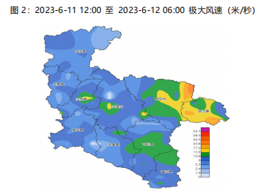 2023年6月11日下午至夜間我市部分地區(qū)出現(xiàn)5~7級陣風天氣。據(jù)統(tǒng)計,2023年6月11日12時至6月12日06時全市共有20個氣象監(jiān)測站極大風力超過6級,全市最大風速出現(xiàn)在旬陽仙河鎮(zhèn)氣象監(jiān)測站25.7m/s,1級(2023年6月11日16時43分)。
