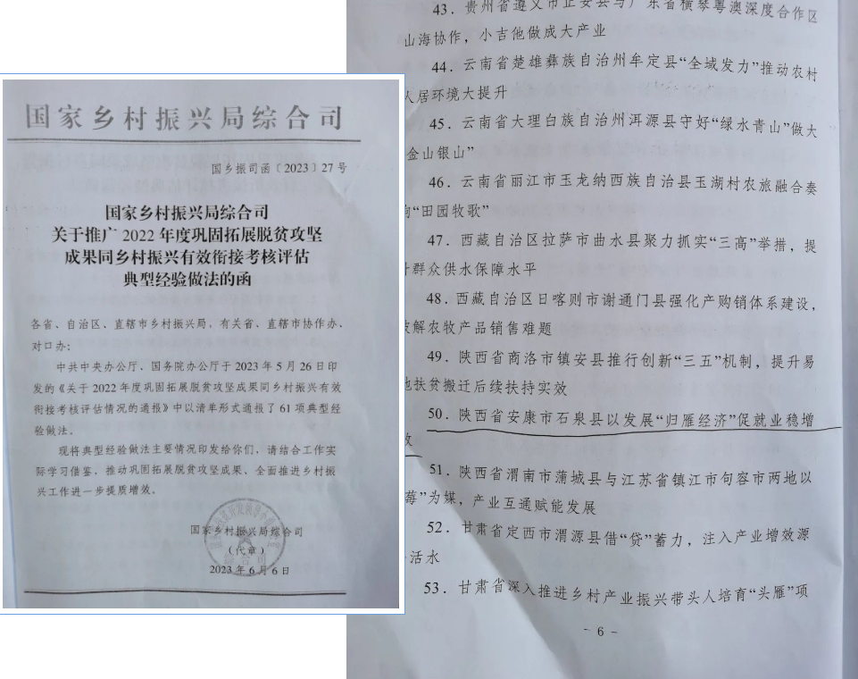 5月26日,由中共中央辦公廳、國(guó)務(wù)院辦公廳印發(fā)的《關(guān)于2022年度鞏固拓展脫貧攻堅(jiān)成果同鄉(xiāng)村振興有效銜接考核評(píng)估情況的通報(bào)》中,以清單形式通報(bào)了61項(xiàng)典型經(jīng)驗(yàn)做法,其中“安康市石泉縣以發(fā)展‘歸雁經(jīng)濟(jì)’促就業(yè)穩(wěn)增收”成功入選。