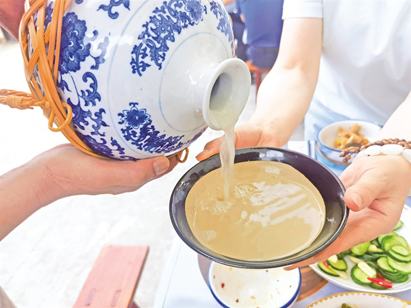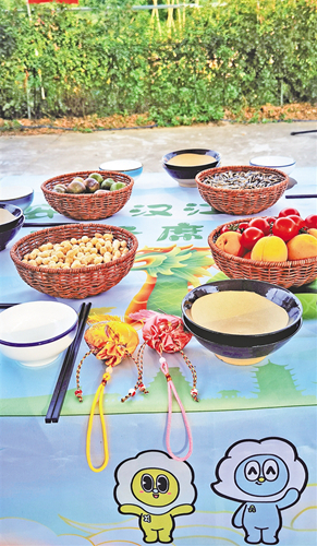 今年的漢江排子席是在復(fù)原的基礎(chǔ)上完善創(chuàng)新,有過(guò)安康門(mén)、開(kāi)席、演唱漢江號(hào)子、安康非遺展示等多個(gè)環(huán)節(jié)。菜色方面,有四碗柱子果寓意四平八穩(wěn),插放梔子花、石榴花,寓意祥符瑞氣、多子多福,一壇黑陶稠酒,上放扎紅飄帶竹制酒提,開(kāi)席后由祝酒仙子用酒提從酒壇斟酒。